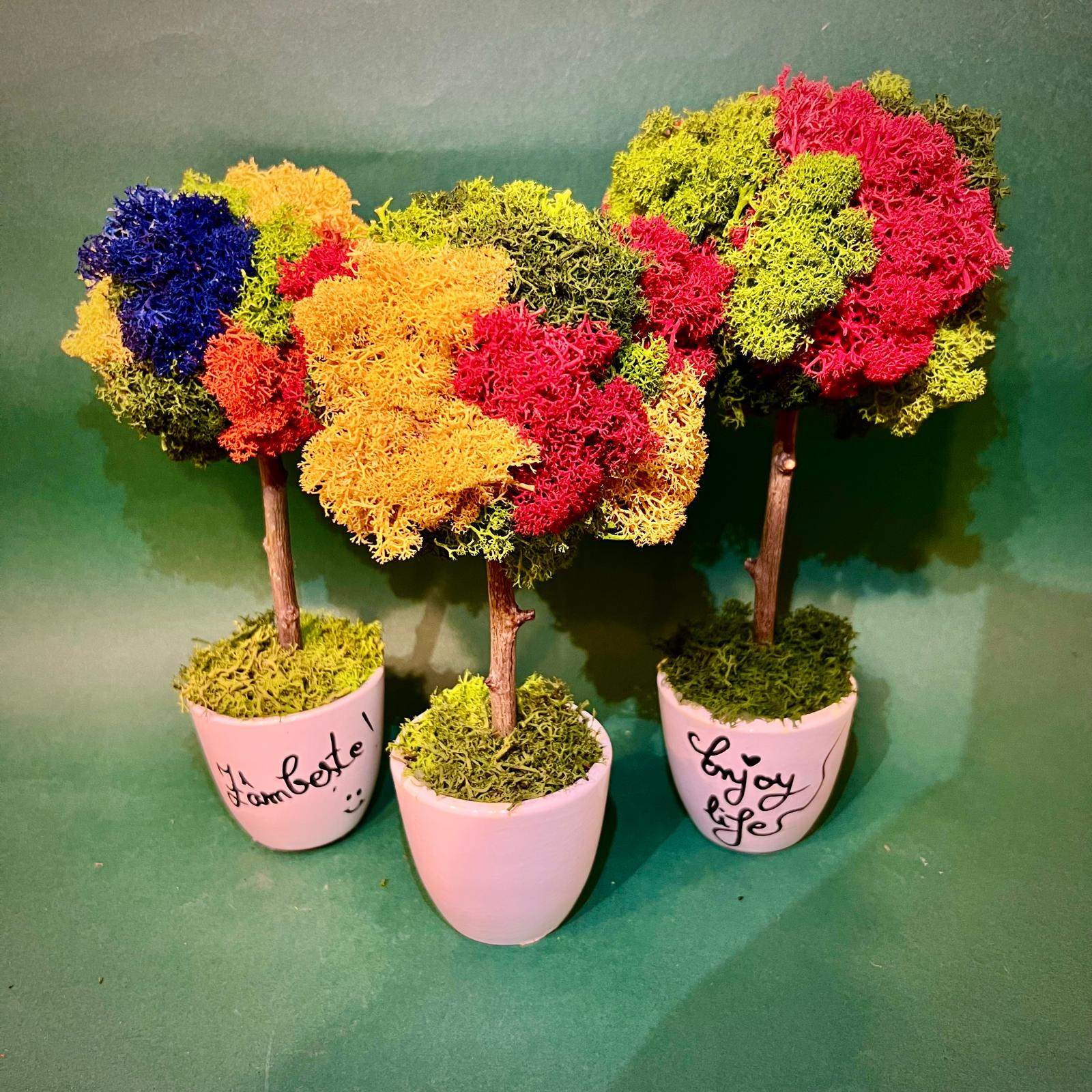 Aranjamentele sunt formate din licheni stabilizati, plante stabilizate si uscate aranjate intr-un vas de ceramica. Zambetul este scris manual, astfel incat fiecare vas va fi diferit, unic si special conceput pentru tine sau pentru persoana careia il oferi. In comanda vei primi o felicitare cadou, iar produsele vor fi ambalate in folie transparenta cu fundita.