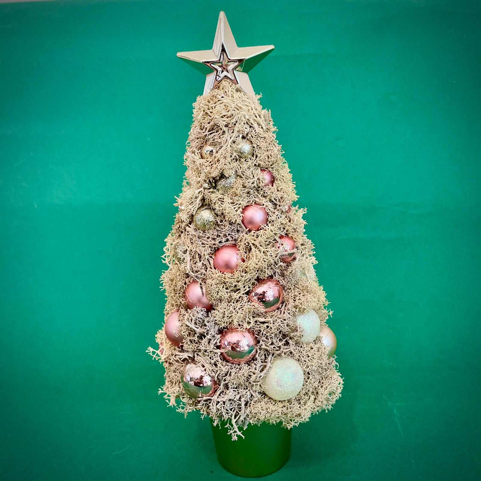 Brăduț handmade din licheni naturali, decorat cu mini-globuri roșii și aurii și o stea festivă în vârf. O piesă veselă și plină de culoare, perfectă pentru a aduce spiritul Crăciunului în orice colț al casei.