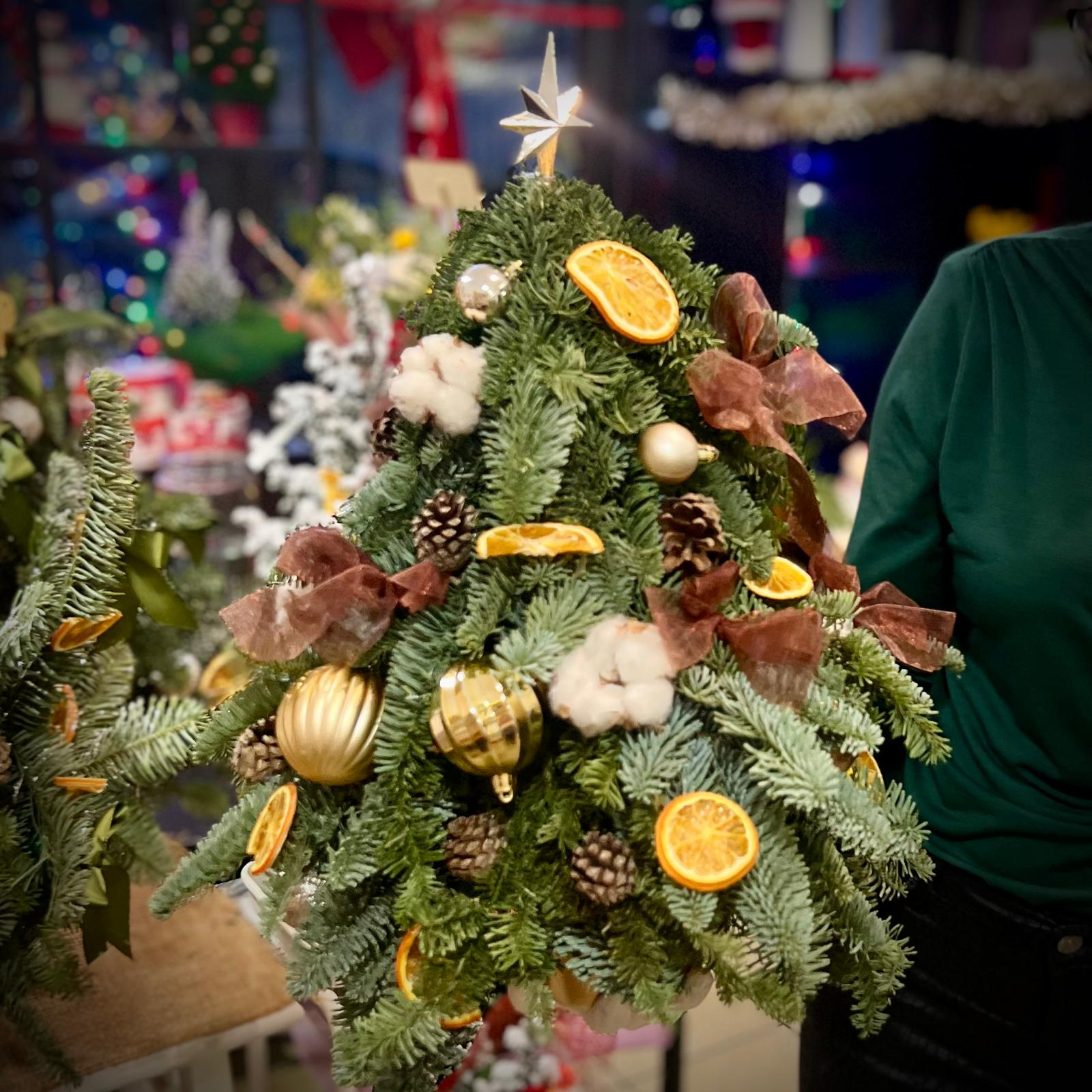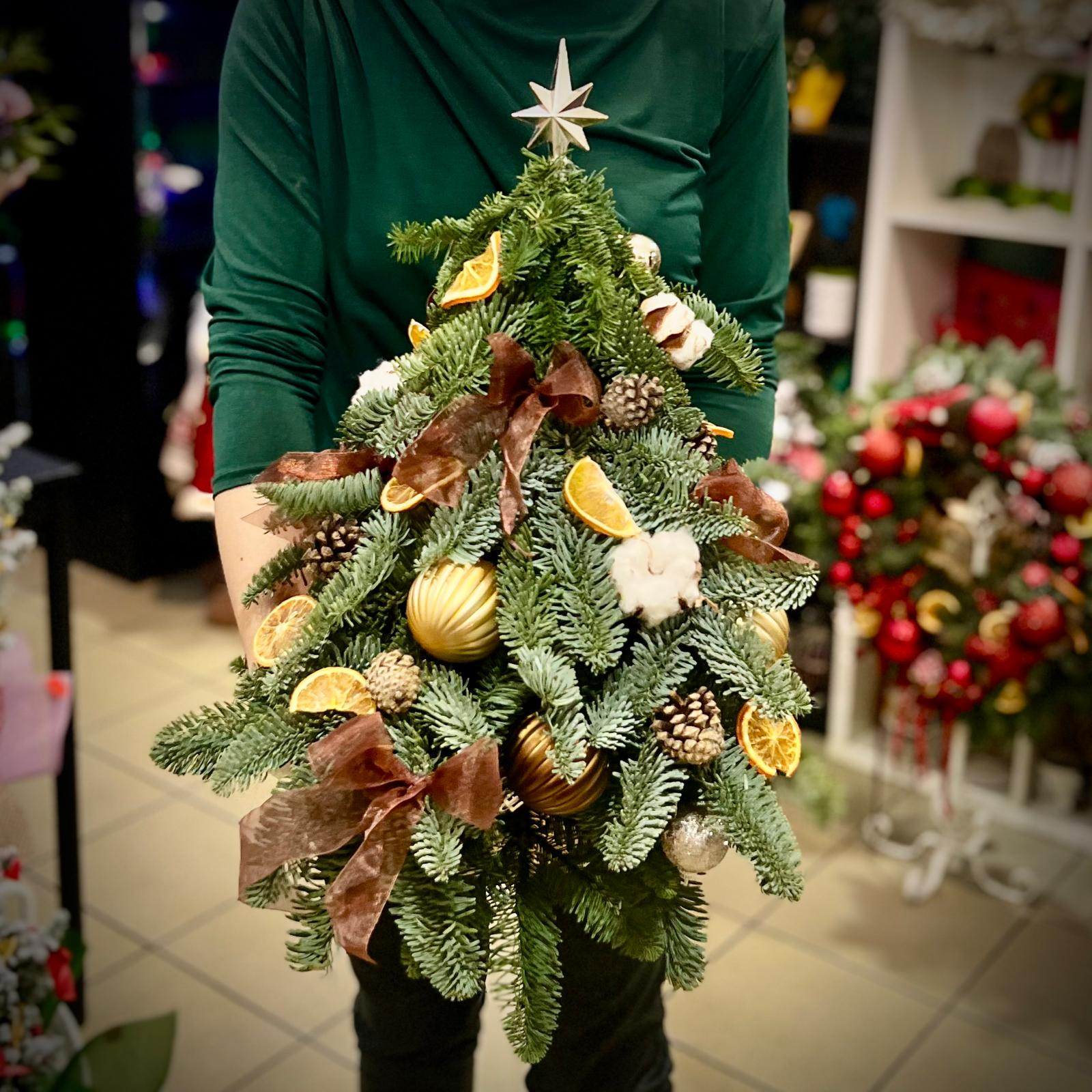 Bradutul este construit manual din crengute de brad argintiu. Are aproximativ 45cm, tot felul de decoratiuni pe nuante de auriu si elemente naturale: portocale uscate de noi in atelier, scortisoara, conuri de brad.
