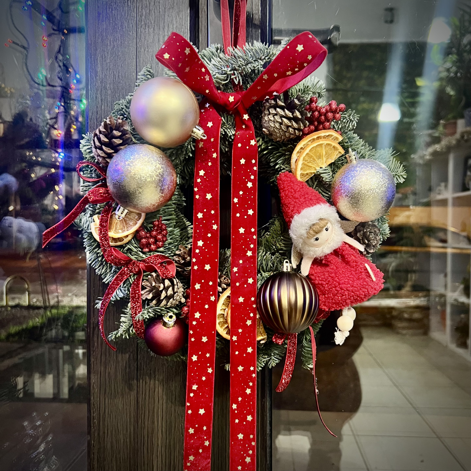 Coronita din brad argintiu: are tot felul de decoratiuni pe rosu si auriu si elemente naturale: portocale uscate de noi in atelier, conuri de brad, etc