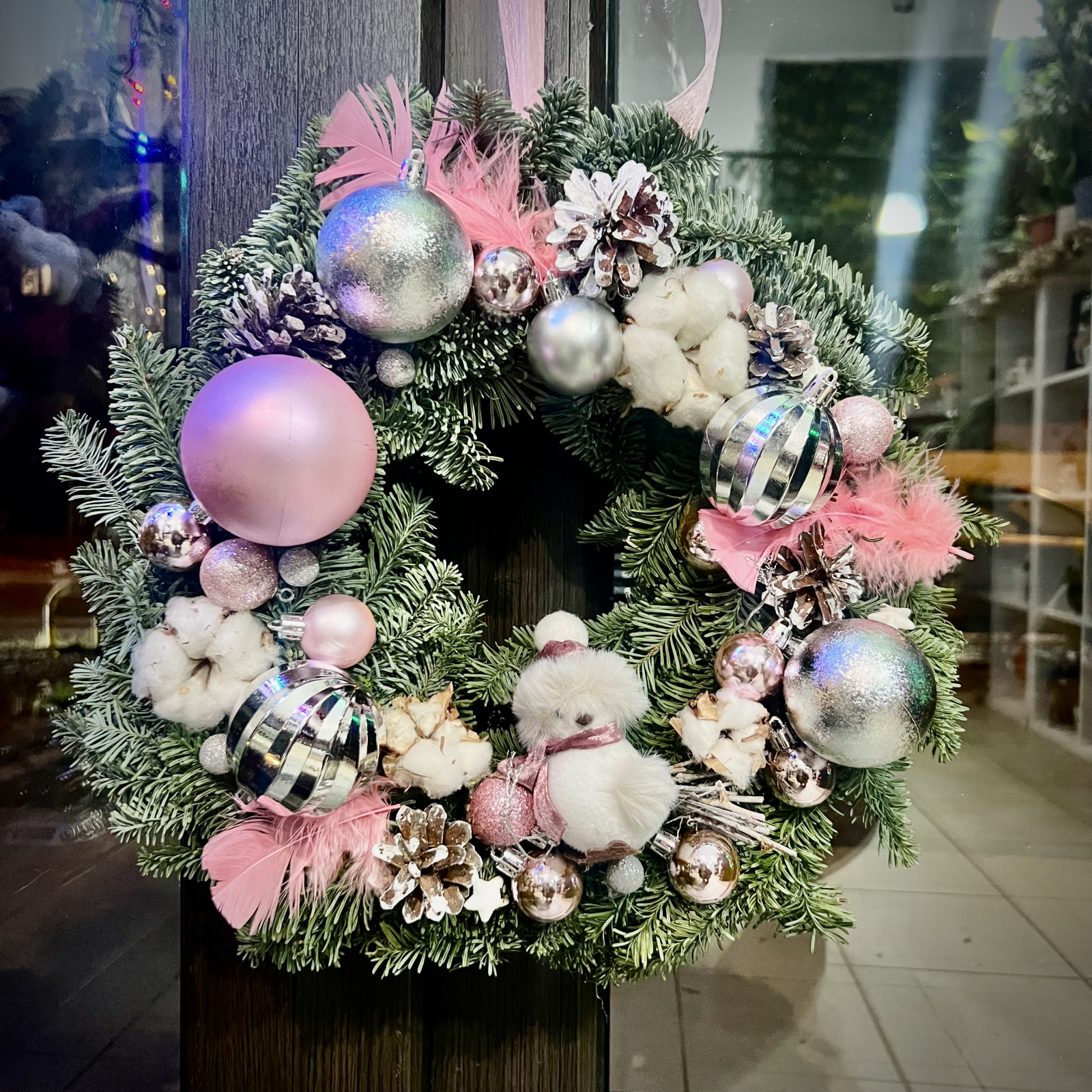 Coronita din brad argintiu: are tot felul de decoratiuni pe roz si argintiu si elemente naturale: conuri de brad, etc