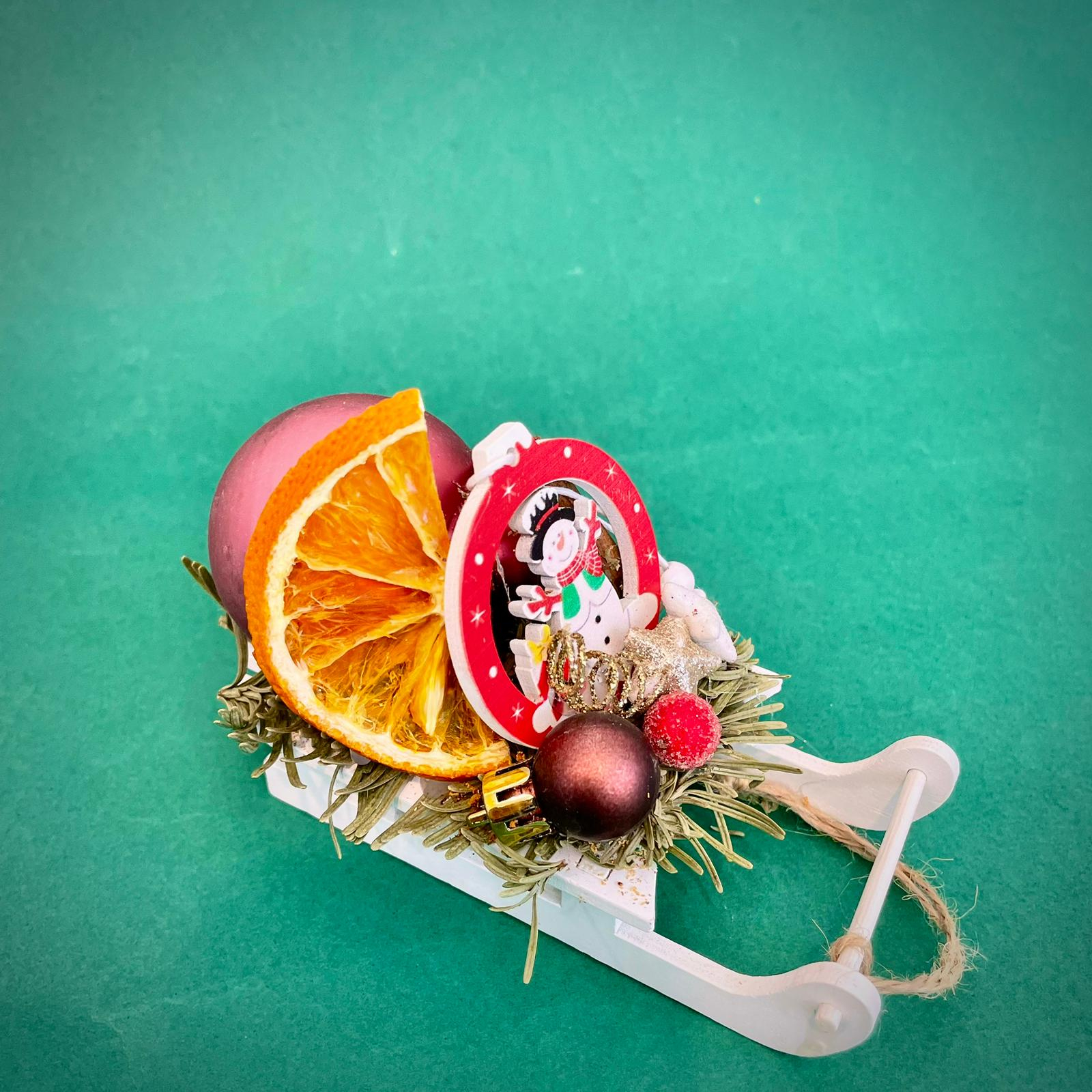 O săniuță chic cu portocală uscată, globulete și decor de iarnă — perfectă pentru cadouri rapide și atmosfera de Crăciun. 12 cm lungime • 9 cm înălțime
