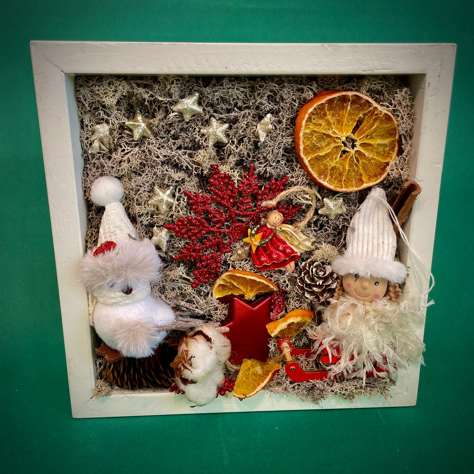 Tablou decorativ de Crăciun, realizat pe un fundal bogat din licheni naturali în nuanțe albe și gri, presărat cu steluțe strălucitoare. Decorul include figurine simpatice (moș, îngeraș și păsărele pufoase), conuri de brad, felii uscate de portocală, bumbac natural, scorțișoară și accente roșii festive. O piesă caldă și jucăușă, ideală pentru a aduce spiritul Crăciunului în orice cameră.