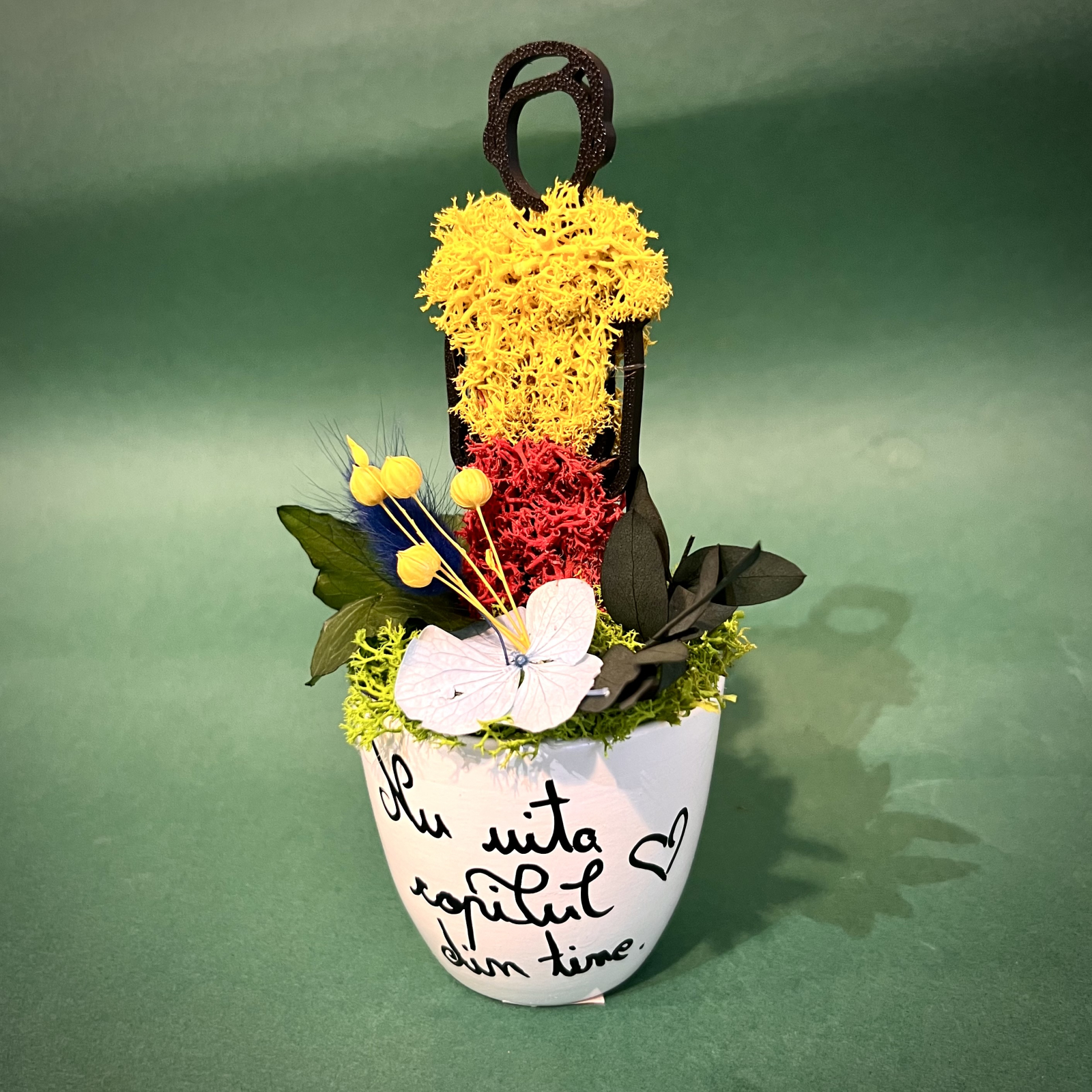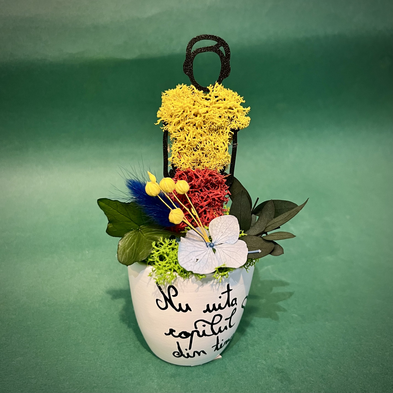 Aranjamentul va surprinde persoana draga pentru o perioada de timp indelungata. Aranjamentul este format din licheni stabilizati aranjati intr-un vas de ceramica alb.