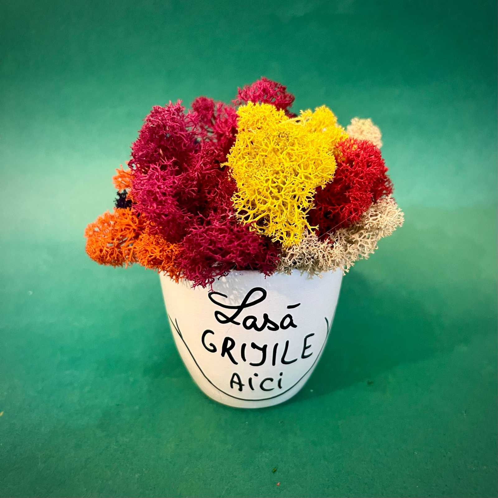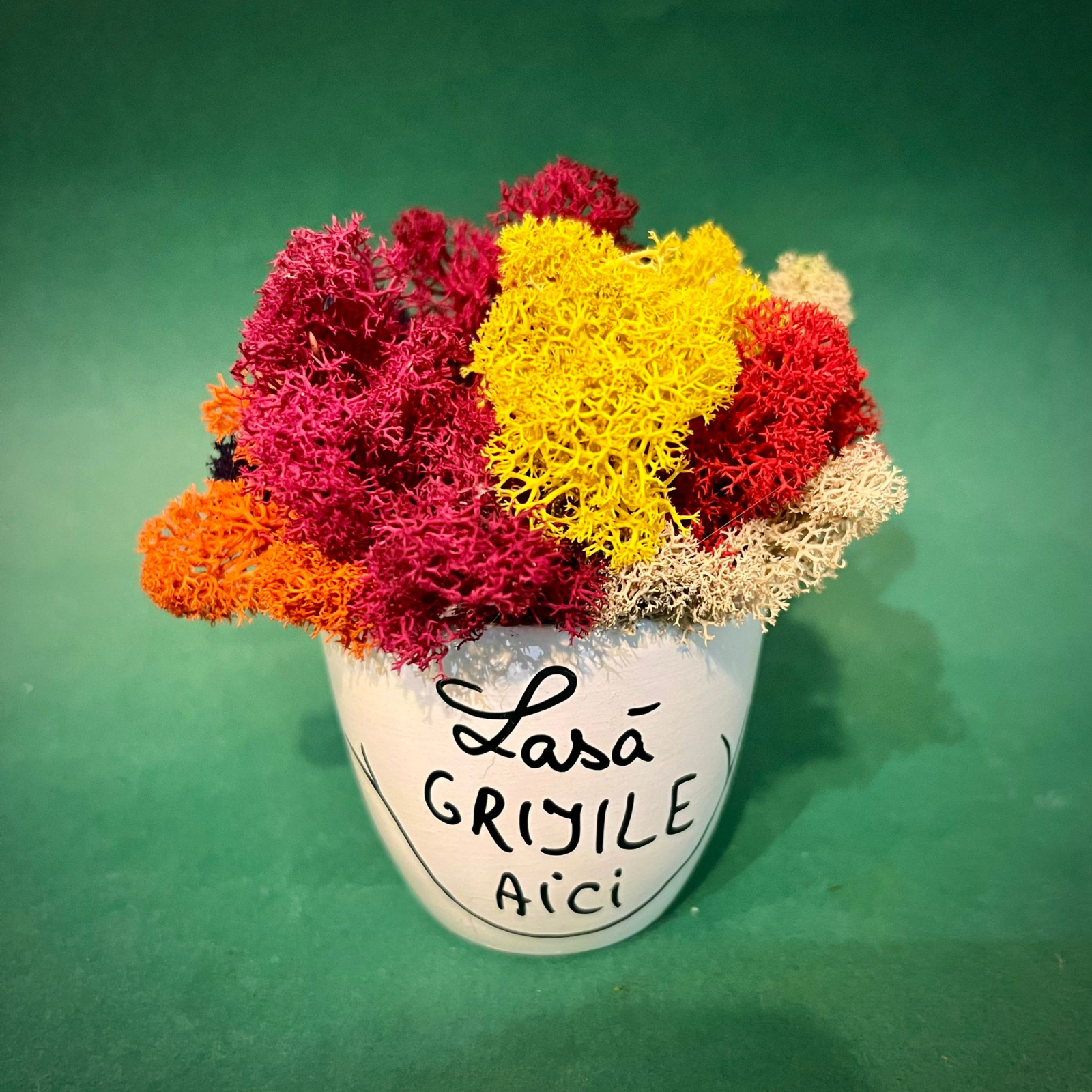 Aranjamentul este format din licheni naturali stabilizati, plante stabilizate si uscate aranjate intr-un vas de ceramica. Textul este scris manual, astfel incat fiecare vas va fi diferit, unic si special conceput pentru tine sau pentru persoana careia il oferi. In comanda vei primi o felicitare cadou, iar produsul va fi ambalat in folie transparenta cu fundita.