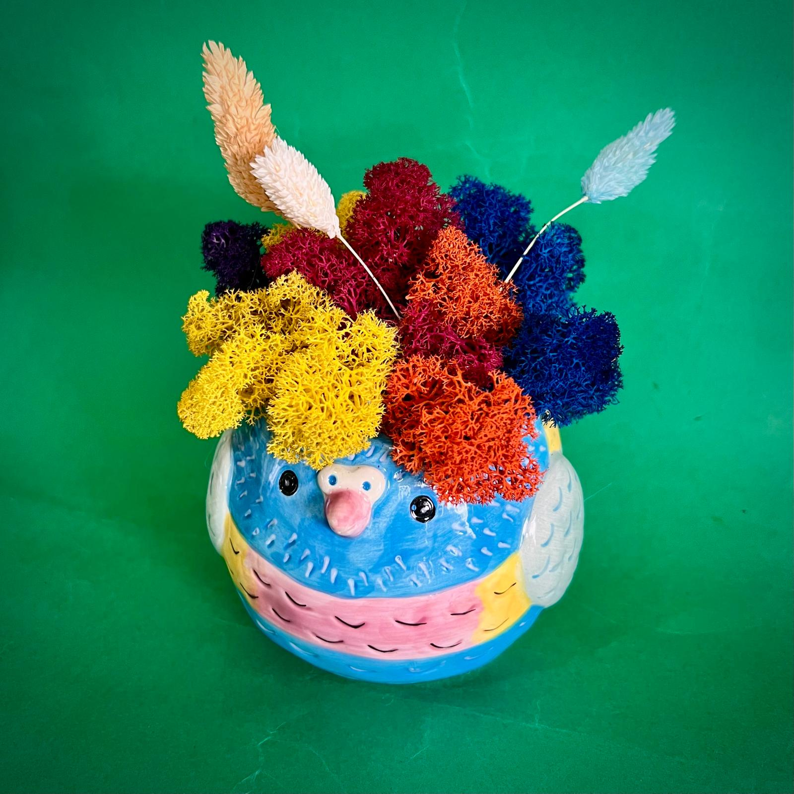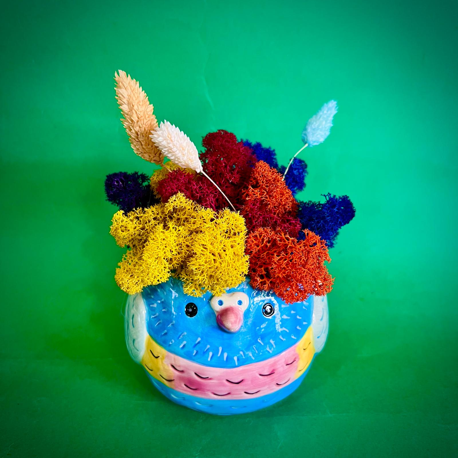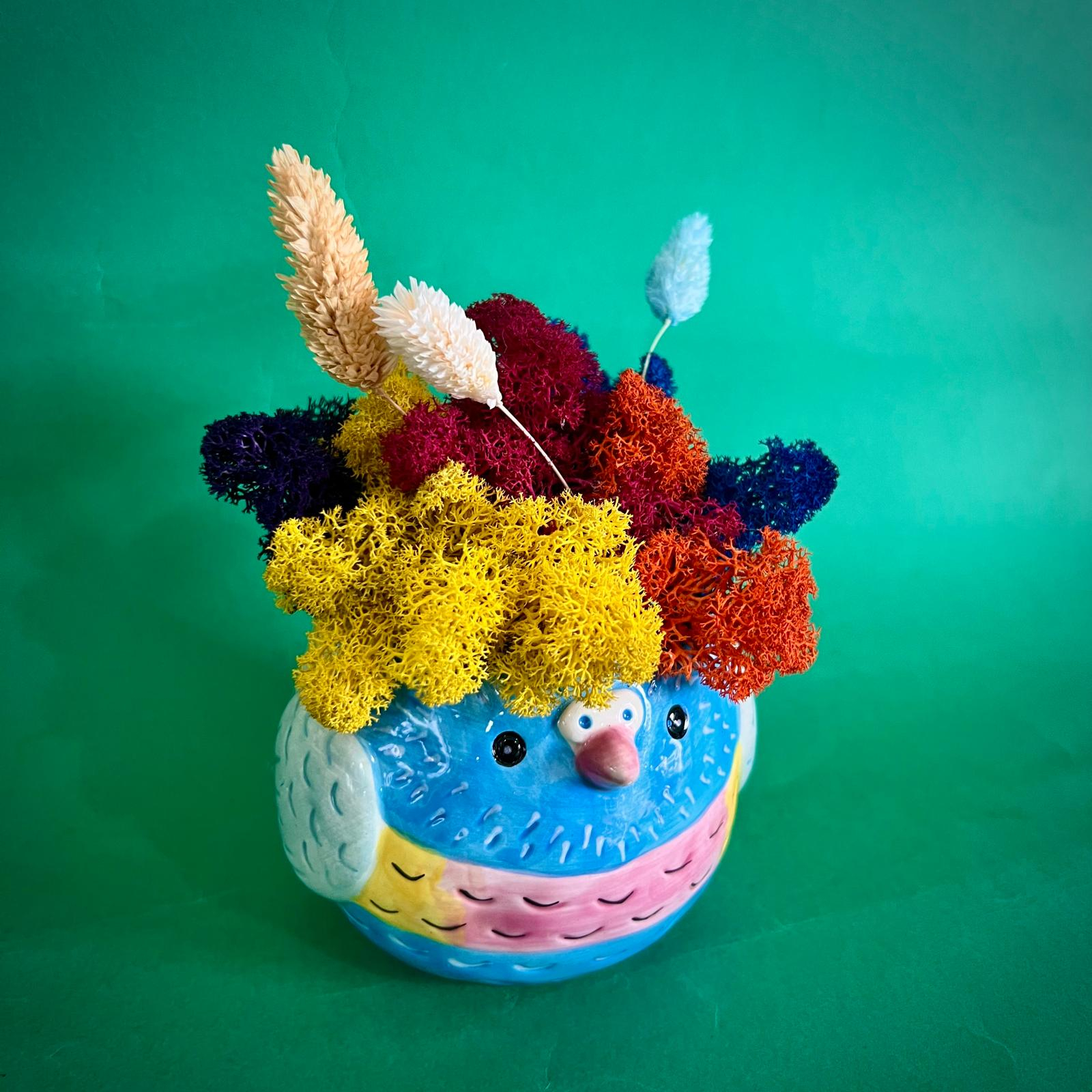 Aranjamentul este format din licheni, flori si plante naturale si stabilizate sau uscate.