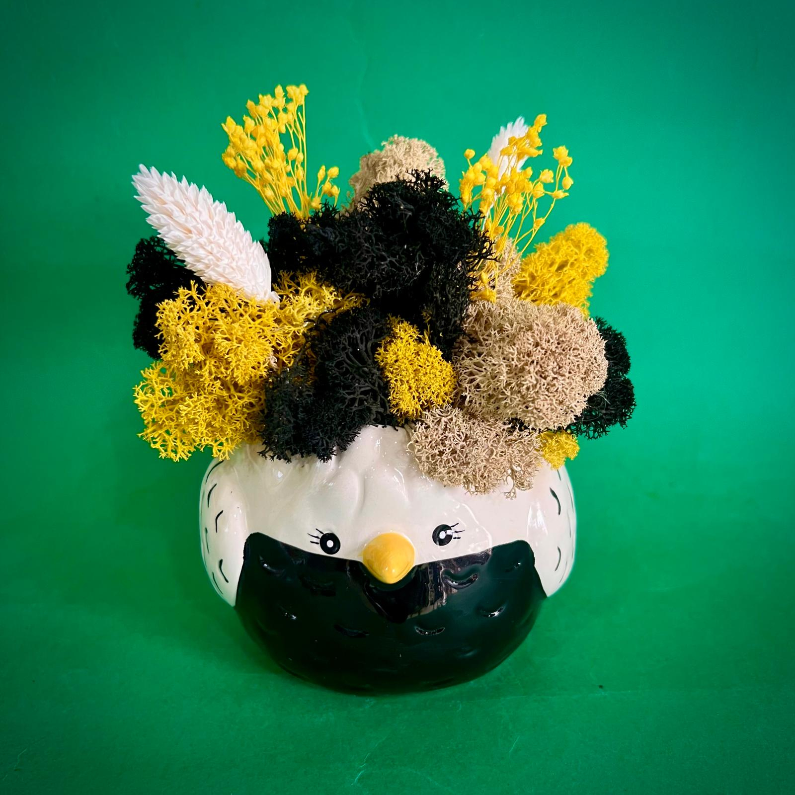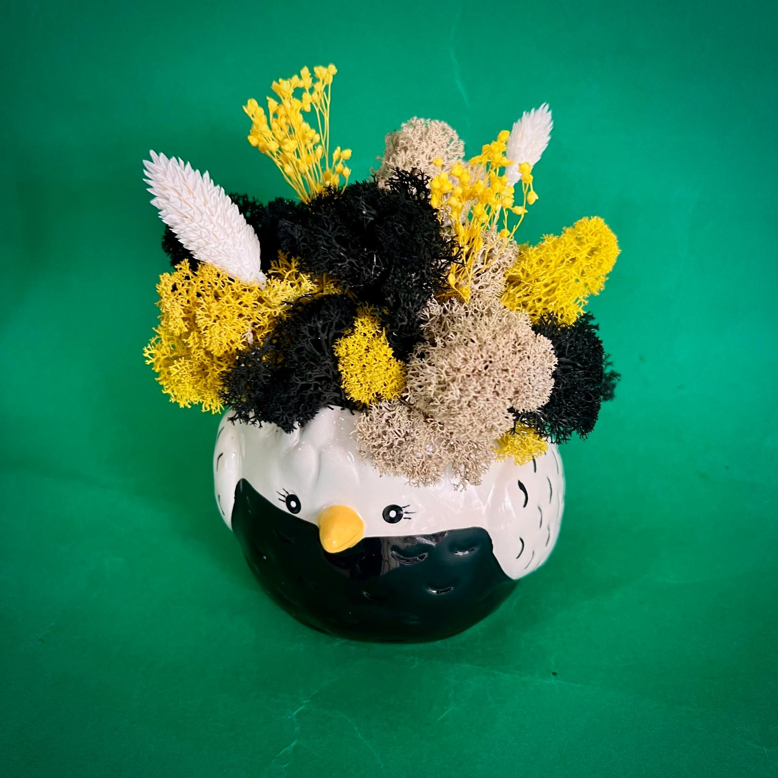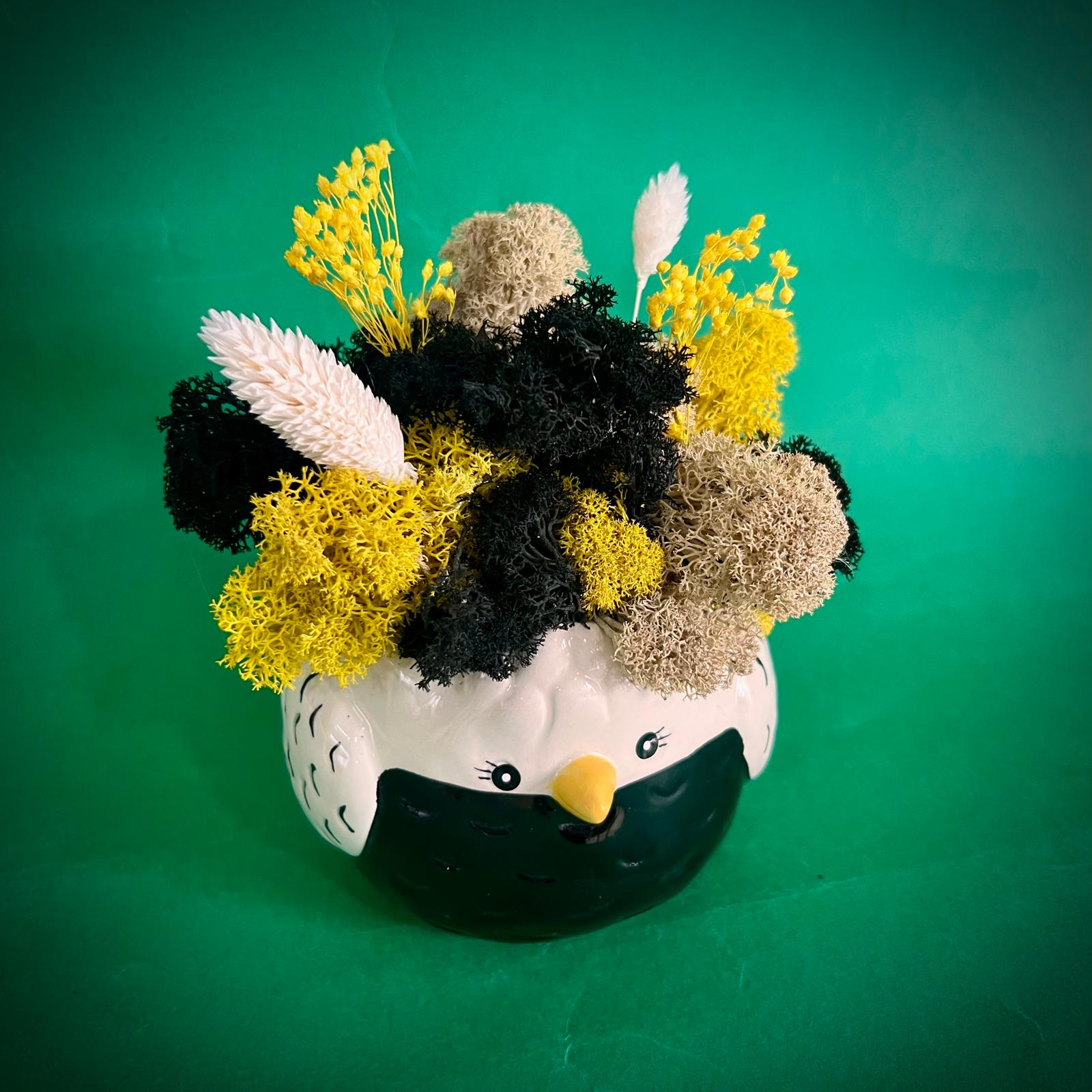 Aranjamentul este format din licheni, flori si plante naturale si stabilizate sau uscate.