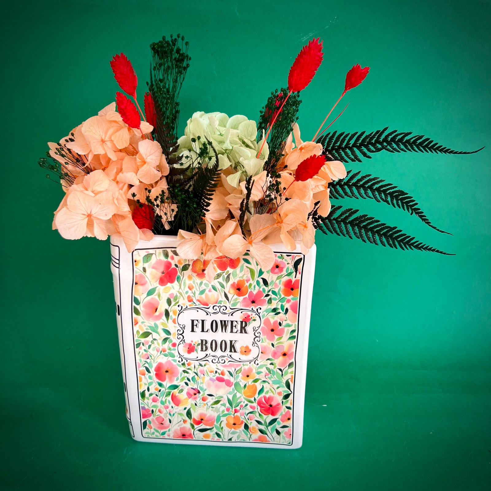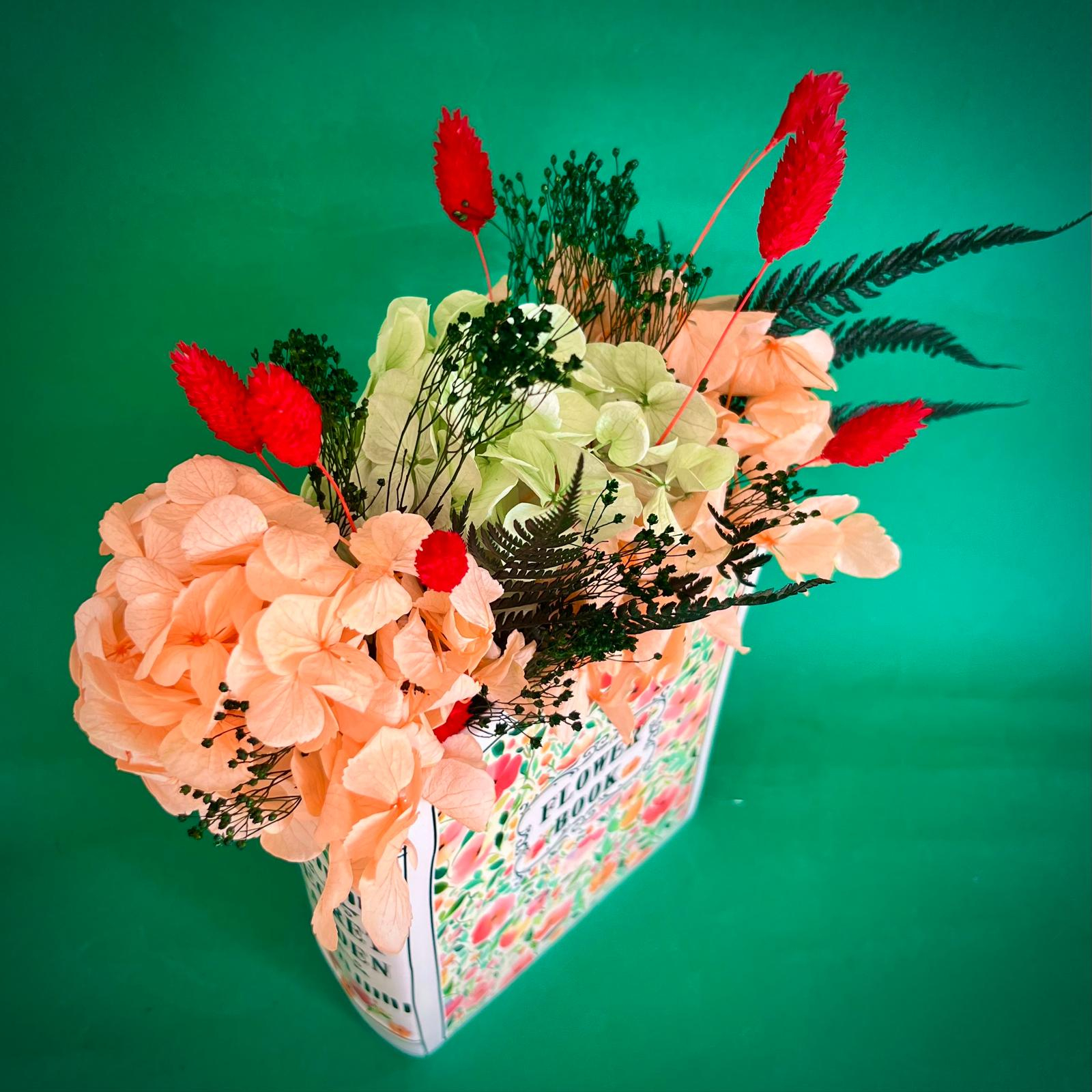 Aranjamentul este format din licheni, flori si plante naturale si stabilizate sau uscate.