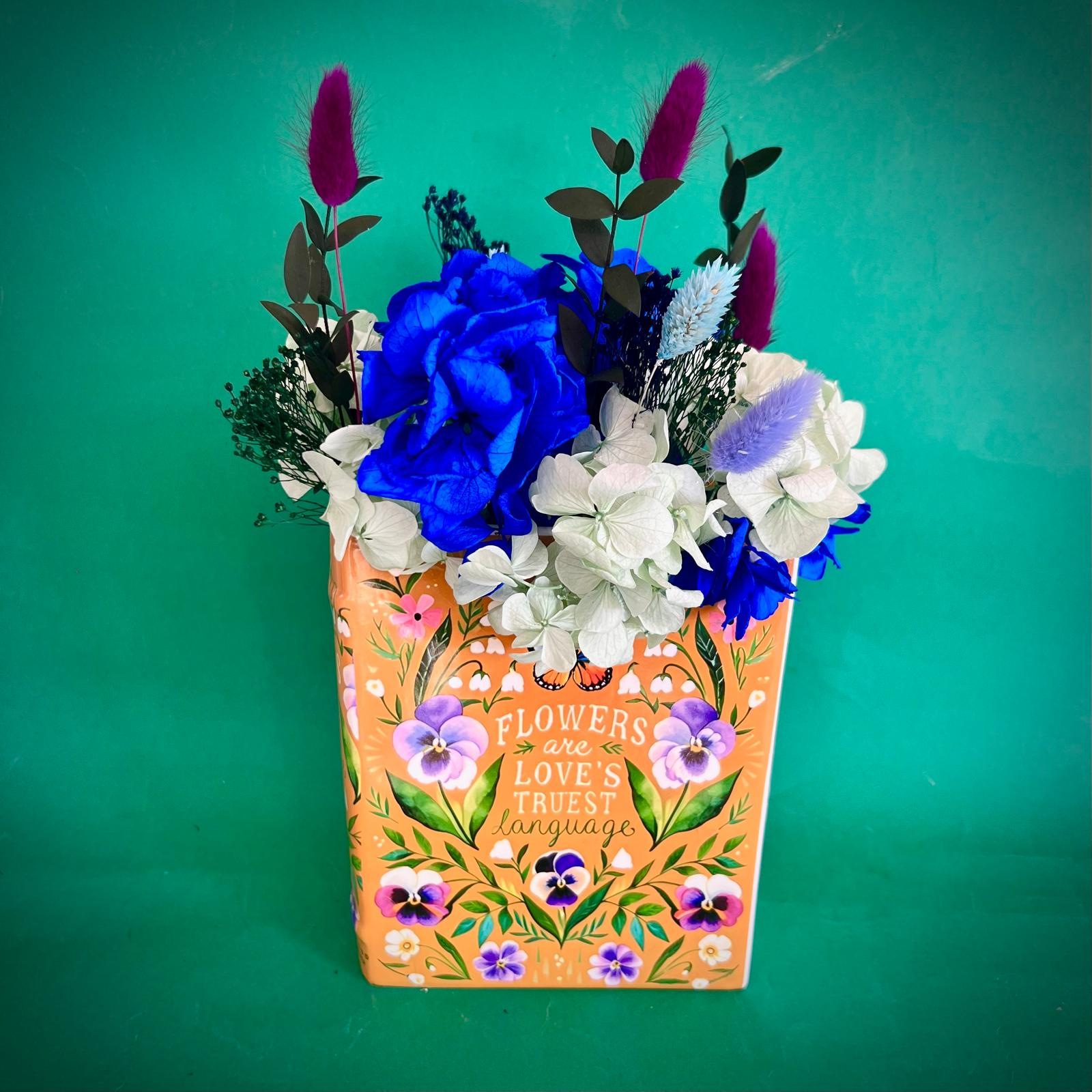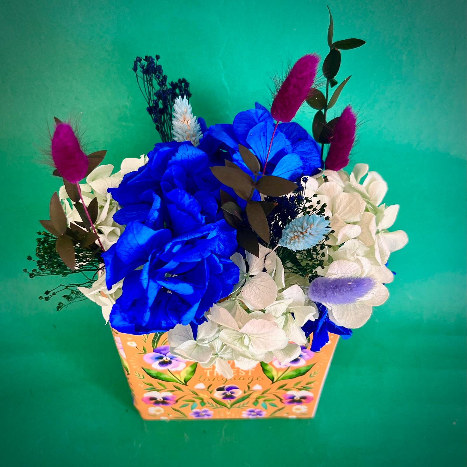Aranjamentul este format din licheni, flori si plante naturale si stabilizate sau uscate.