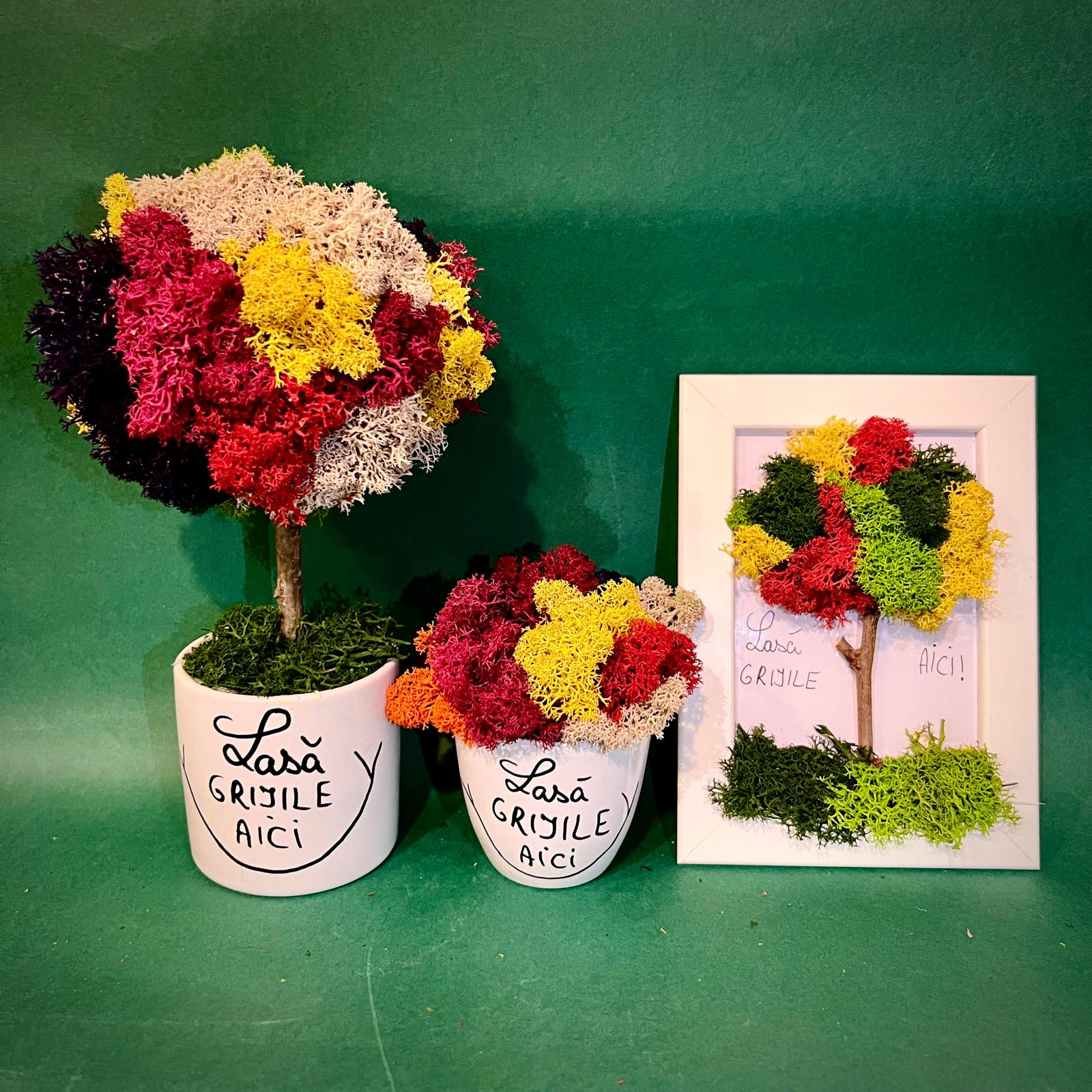 Pachetul contine cele 3 aranjamente: copacel, vas mic si tablou cu tematica Lasa grijile.