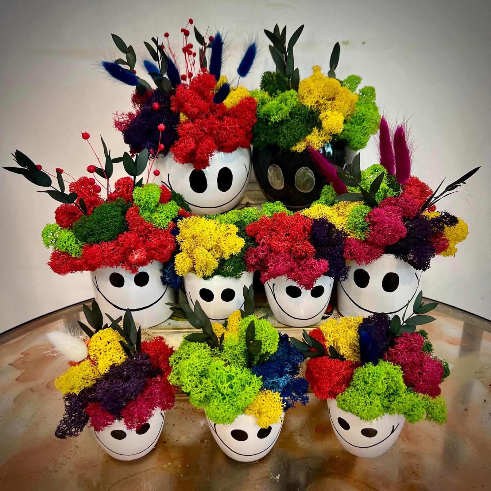 Aranjamentele sunt formate din licheni stabilizati, plante stabilizate si uscate aranjate intr-un vas de ceramica. Zambetul este scris manual, astfel incat fiecare vas va fi diferit, unic si special conceput pentru tine sau pentru persoana careia il oferi. In comanda vei primi o felicitare cadou, iar produsele vor fi ambalate in folie transparenta cu fundita.